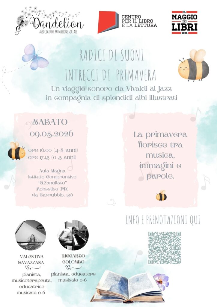 “Radici di suoni – Intrecci di Primavera” è un concerto educativo per famiglie con bambini da 0 a 8 anni, concepito secondo i principi della Music Learning theory di Edwin Gordon, che si intreccia, per Il maggio dei Libri, con la lettura di albi illustrati appositamente selezionati in abbinamento alle musiche proposte.